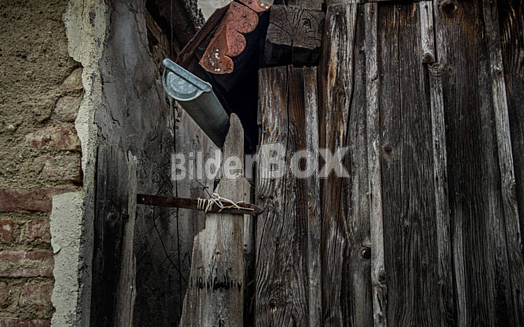 Beschreibung Eine Dachrinne wird behelfsmässig abgestützt. Symbol für Helfen und Provisorium