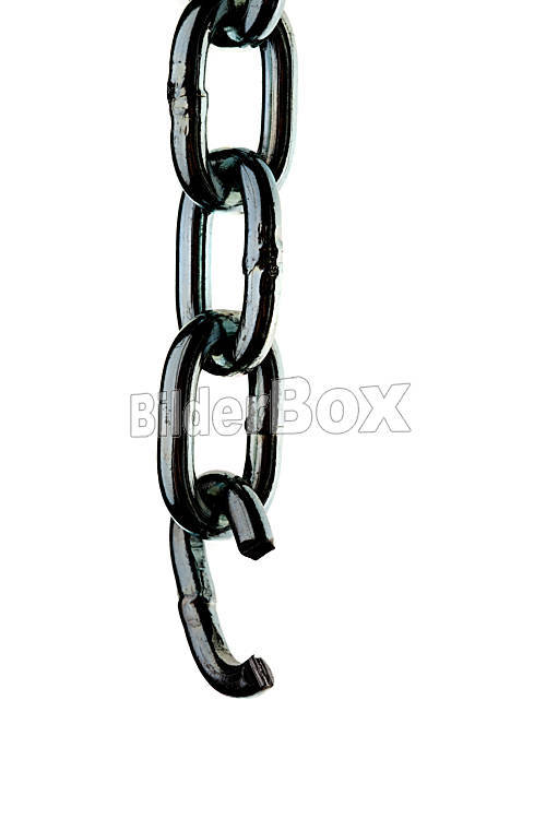 Beschreibung Defekte Stahlkette vor weissem Hintergrund. Schwaches Glied in einer Kette
