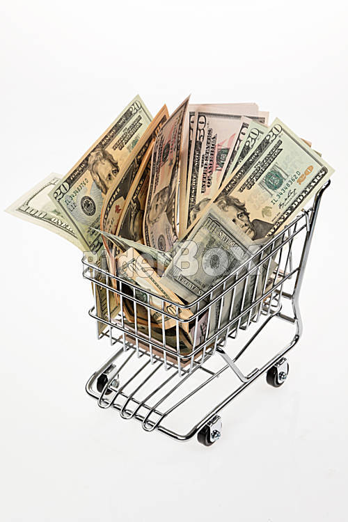 Beschreibung Geld amerikanische Dollar Geldscheine in einem Einkaufskorb