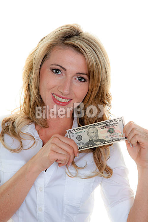 Beschreibung Dollar Geldschein und junge Frau vor weißem Hintergrund