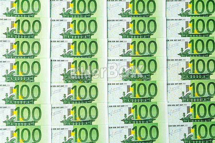 Beschreibung Viele einhhundert Euro Geldscheine liegen nebeneinander. Symbolfoto für Reichtum und Geldanlage