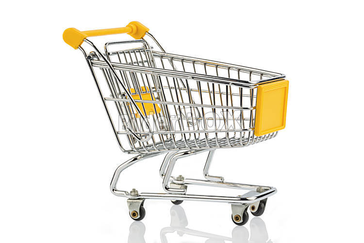 Beschreibung Ein leerer Einkaufswagen auf weißem Hintergrund. Symbolfoto für Einkaufen