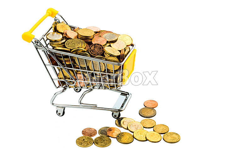 Beschreibung Ein Einkaufswagen ist mit Euromünzen gut gefüllt, Symbolfoto für Kaufkraft und Konsum