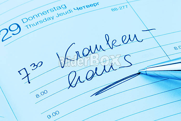 Beschreibung Ein Termin ist in einem Kalender eingetragen: Krankenhaus
