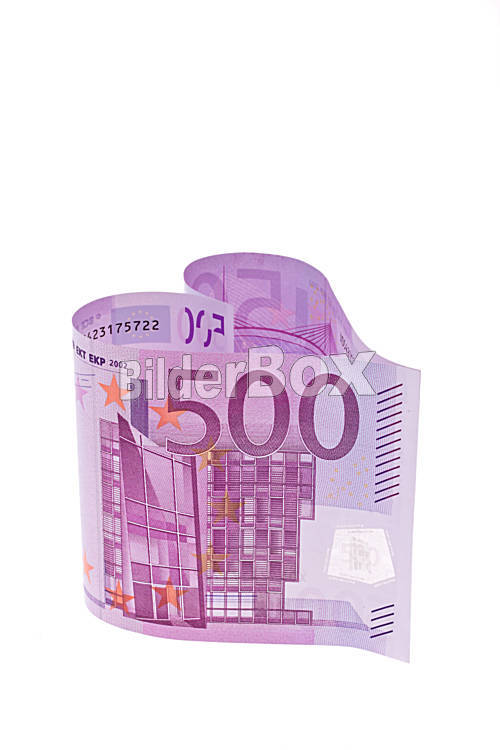 Beschreibung 500 Euro Geldschein in Form eines Herzens. vor weißem Hintergrund