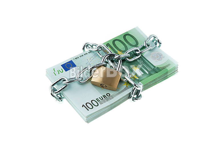 Beschreibung Euro Geldscheine mit Schloss und Kette. Geldstapel für Sicherheit und Geldanlage.