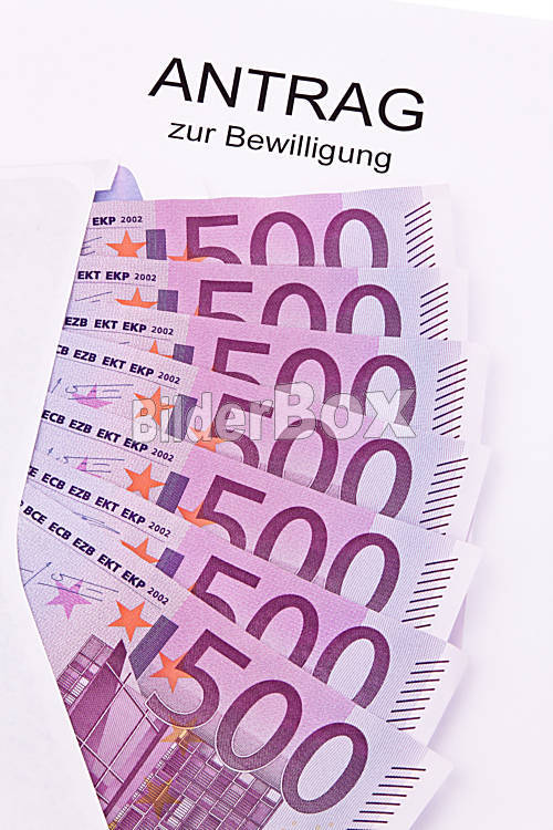 Beschreibung Viele Euro Geldscheine und Antrag. Auf weißem Hintergrund