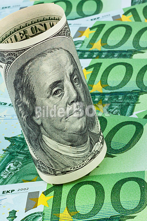 Beschreibung Euro-Geldscheine. Banknoten der europäischen Union. Und amerikanische Dollar