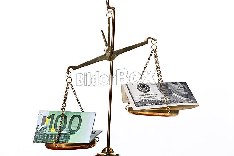Beschreibung Euro Geldscheine und Dollar auf einer Waage