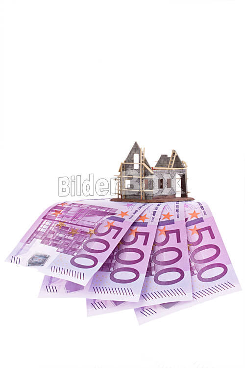 Beschreibung Viele Euro Geldscheine und Rohbau eines Hauses