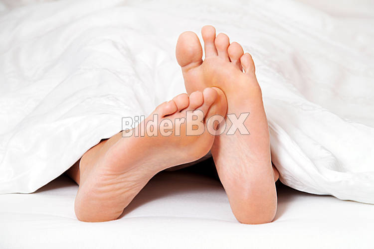 Beschreibung Zwei Füße im Bett schauen unter einer Bettdecke hervor.