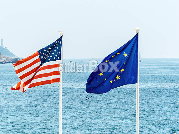 Beschreibung Fahnen der Europäischen Union und der USA, Symbolfoto für Partnerschaft, Diplomatie, Außenpolitik