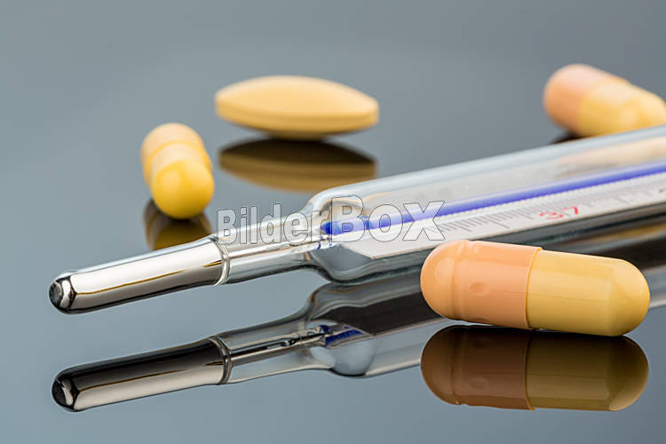 Beschreibung Ein Fieberthermometer und Tabletten. Symbolfoto für Grippe und Erkältungen