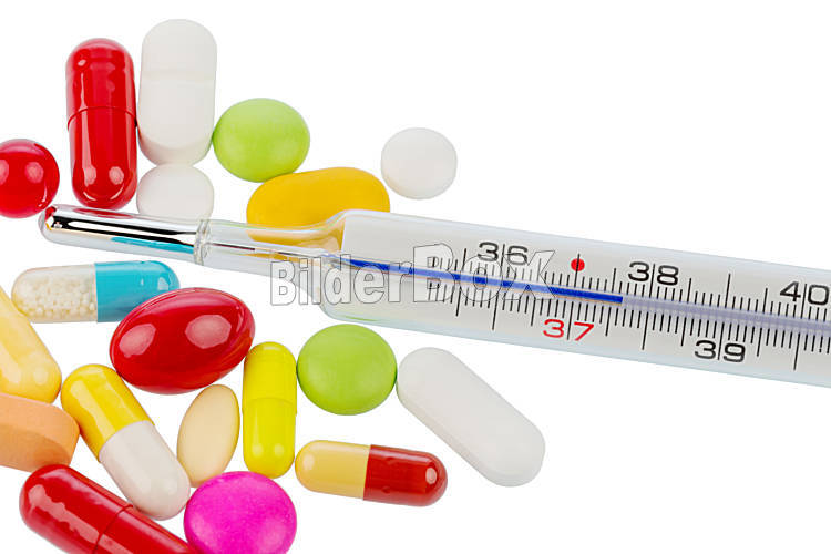 Beschreibung Fieberthermometer und Tabletten, Symbolfoto für Krankheit und Medikation