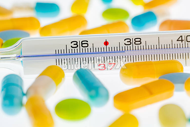 Beschreibung Ein Fieberthermometer und Tabletten. Symbolfoto für Grippe und Erkältungen