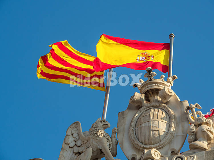 Beschreibung Spanien, Barcelona. Flaggen Spanien und Katalonien