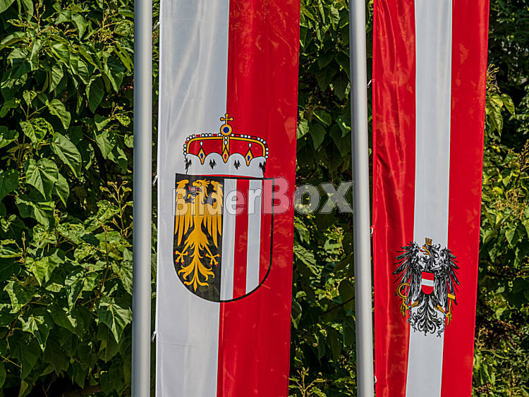 Beschreibung Oberösterreich und Österreichische Flaggen mit Staatswappen