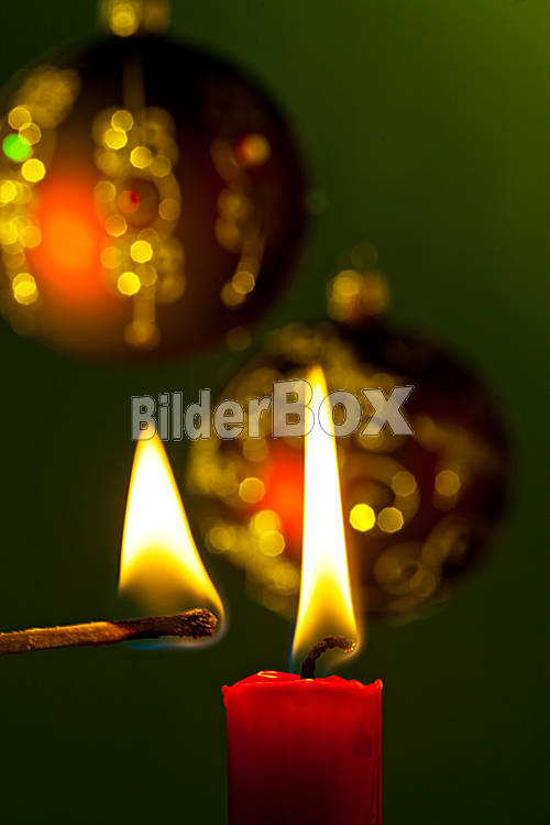 Beschreibung Die Flamme einer Kerze bringt Licht in die Dunkelheit. Mit Weihnachtskugeln