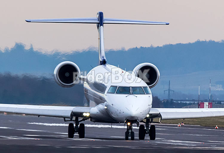 Beschreibung Flugzeug auf der Startbahn eines Flughafens. Bereit zum Start