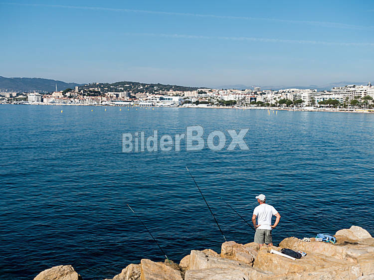 Beschreibung Mann mit Angel in Nizza, Frankreich an der Strandpromenade