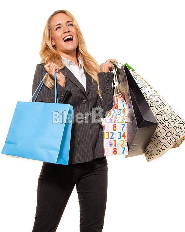 Beschreibung Frau beim Einkaufen mit vielen Einkaufstaschen hat Freude