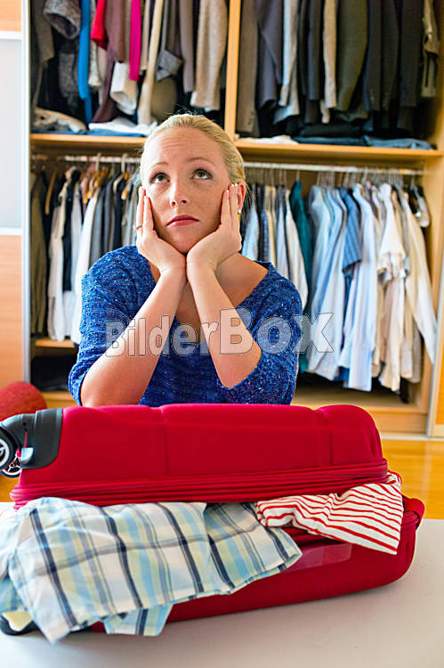 Beschreibung Eine junge Frau packt ihren Koffer für die Reise in den Urlaub.