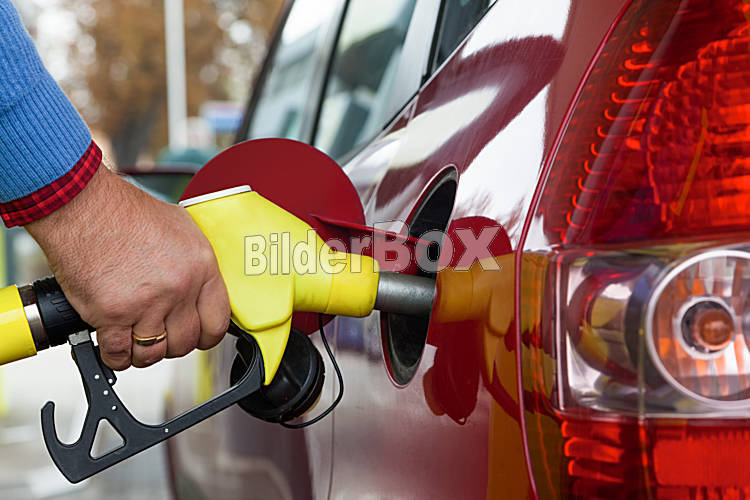 Beschreibung Eine junge Frau Tankbenzin auf einer Tankstelle. Die Kosten für das Auto werden wegen der Benzinpreise immer teurer