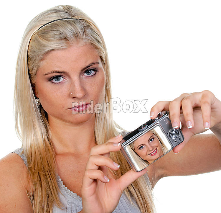 Beschreibung Junge Frau fotografiert mit Zauber Kamera: Ernst-Lachend