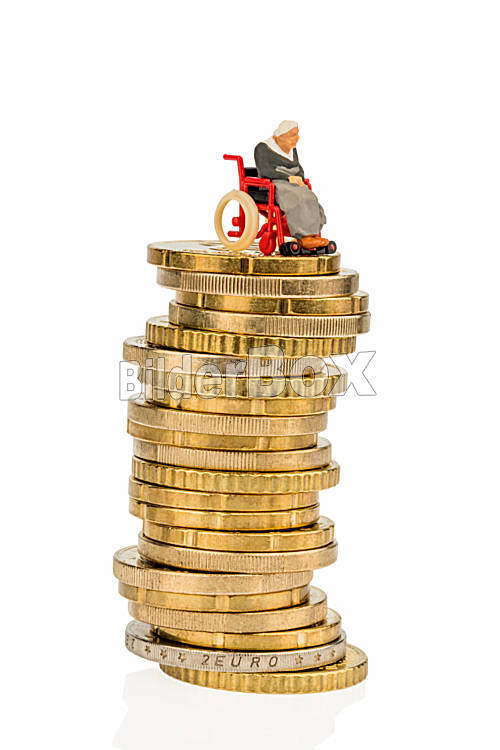 Beschreibung Frau im Rollstuhl auf Geldstapel. Vor weißem Hintergrund