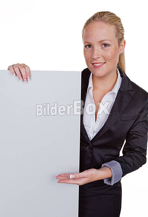 Beschreibung Eine junge hübsche Frau in Business Kleidung mit einer leeren Werbetafel.