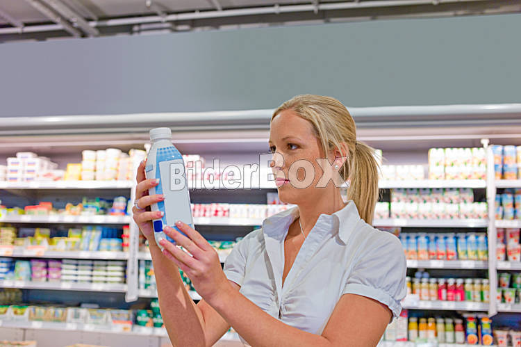 Beschreibung Eine junge Frau kauft Milch im Supermarkt. Steht vor dem Kühlregal.