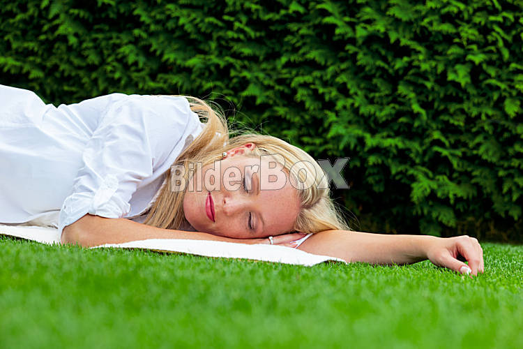 Beschreibung Eine junge Frau liegt zur Erholung in der Wiese. Mittagspause im Park.
