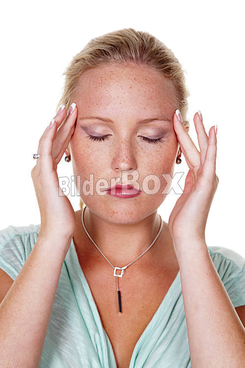 Beschreibung Eine junge Frau hat Kopfweh und Migräne. Akupressur als Therapie.