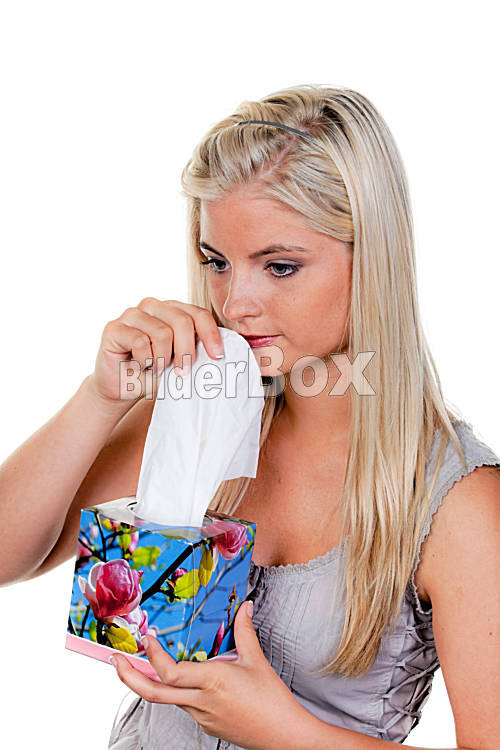 Beschreibung Frau mit Allergie, Heuschnupfen und Taschentuch