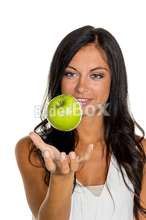 Beschreibung Eine junge Frau hält einen Apfel in der Hand. Obst und Gemüse für gesunde und vitaminreiche Ernährung