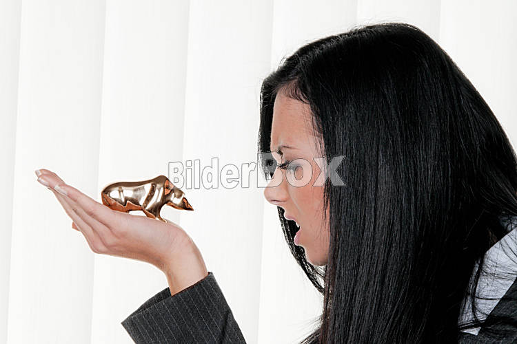 Frau mit Börsen Symbol Bär. Verlust bei Aktienkursen.