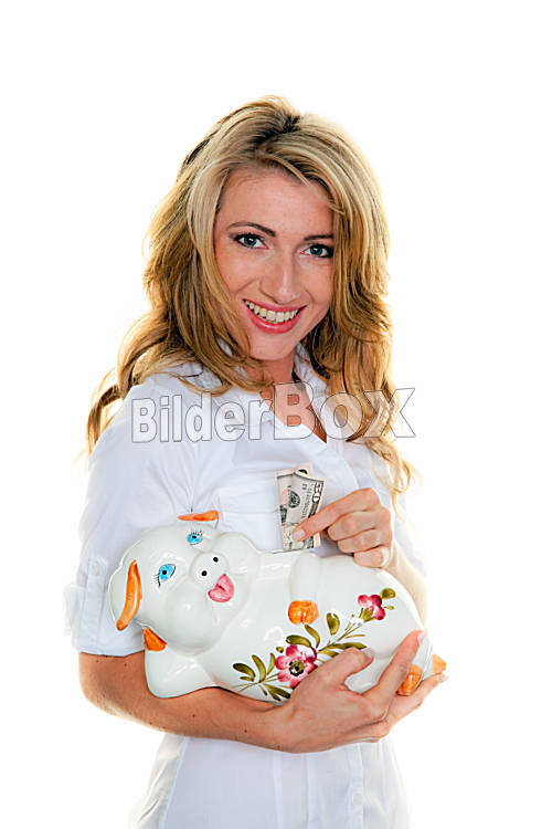 Beschreibung Junge Frau mit Dollar Geldscheinen und Sparschwein
