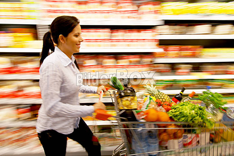Beschreibung Junge Frau mit Einkaufswagen im Supermarkt beim Einkauf