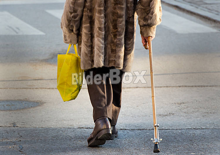 Beschreibung Eine ältere Frau mit einer Einkaufstasche und einem Gehstock.