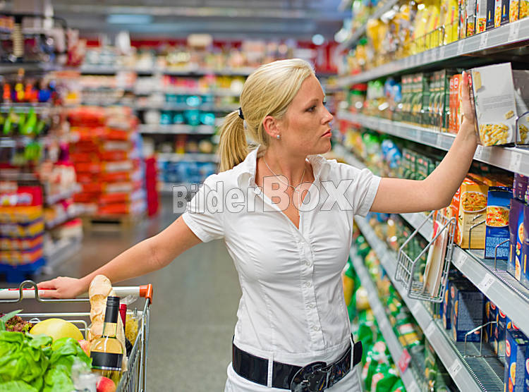Beschreibung Eine Frau beim Einkauf von Lebensmittel in einem Supermarkt. Alltag einer Hausfrau