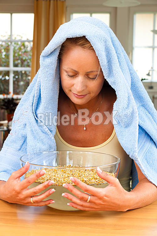 Frau mit Erkältung und Grippe. Inhalieren von Kräutern.