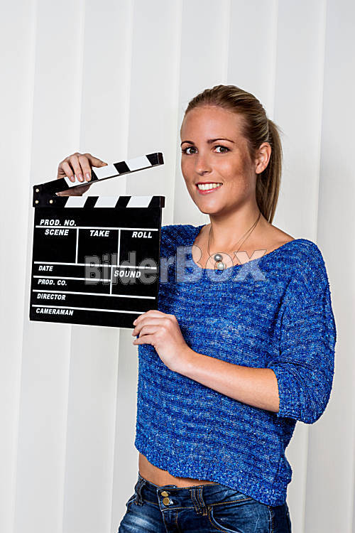 Beschreibung Eine Frau hält eine typische Filmklappe in ihrer Hand