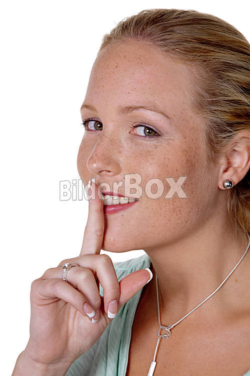 Beschreibung Eine Frau mit Finger am Mund. Symbolfoto für Verschwiegenheit und Geheimnisse