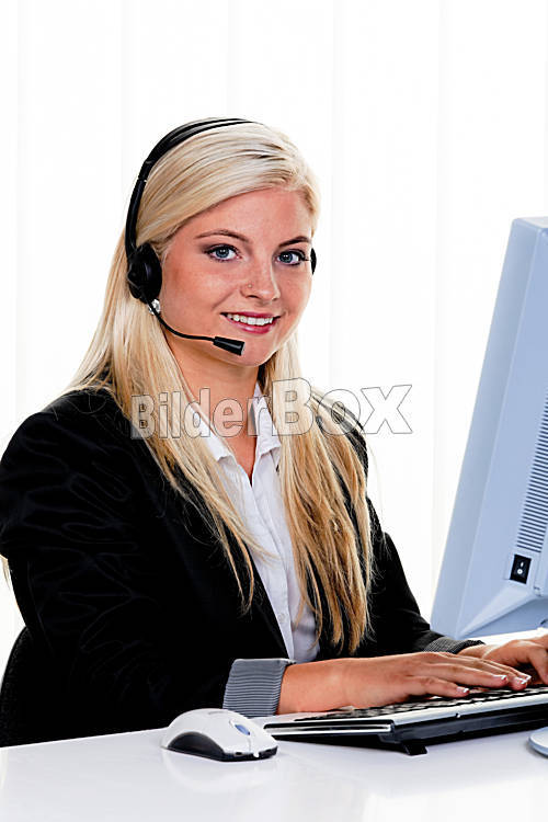 Beschreibung Junge Frau mit Headset und Computer bei Hotline.