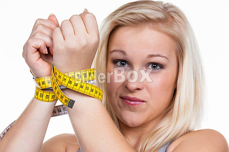 Beschreibung Eine junge Frau mit einem Maßband vor der nächsten Diät. Abnehmen und fasten