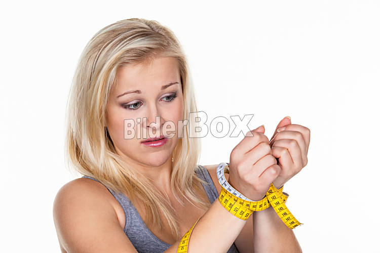 Beschreibung Eine junge Frau mit einem Maßband vor der nächsten Diät. Abnehmen und fasten