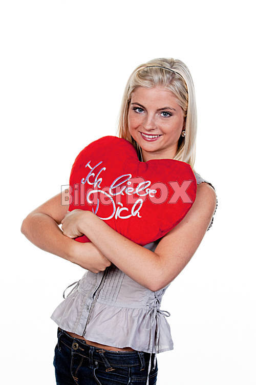 Beschreibung Junge Frau mit Polster: Ich liebe Dich.
