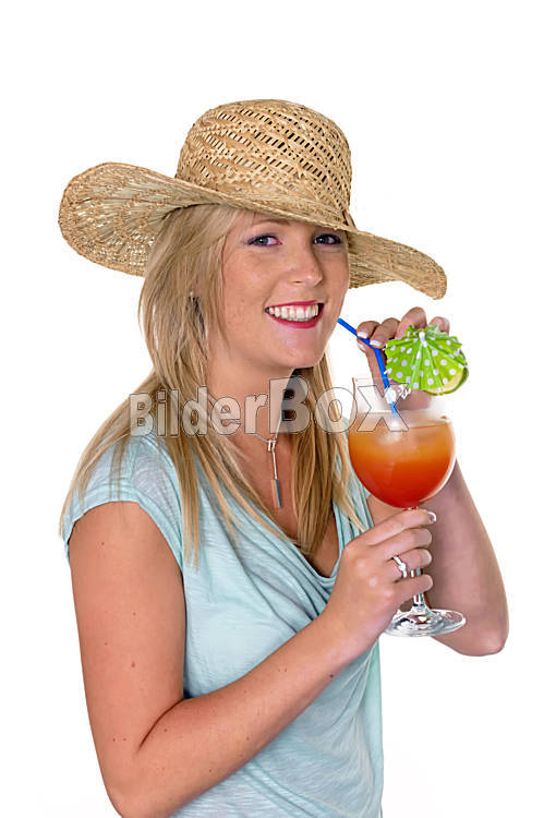 Beschreibung Eine junge Frau mit einem Sonnenhut trinkt im Urlaub einen Cocktail.