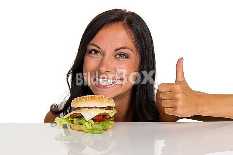 Beschreibung Eine junge Frau mit einem Hamburger. Fast food und schnelle Küche