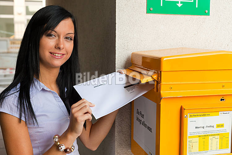 Beschreibung Junge Frau mit einer Wahlkarte (Österreich)